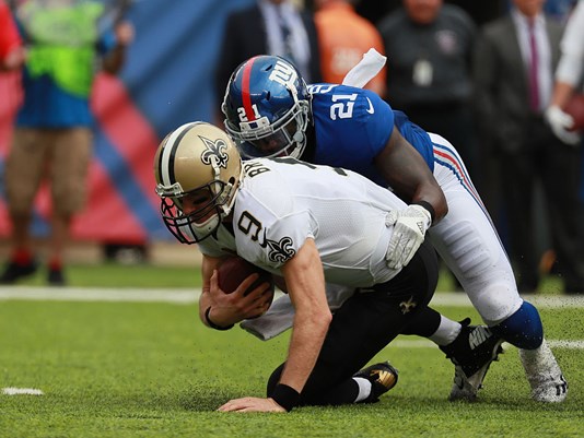 Last season’s matchup between the New York Giants and the New Orleans Saints was a high scoring affair (52-49 Saints def. Giants ), marked by poor defense and gaudy offensive numbers from Drew Brees and Eli Manning.  This time around both teams struggled to get into the end zone with the Saints accounting for the only offensive touchdown on the day ( a 17 yard TD from Brees pass to Willie Snead ).  The key to the Giants victory was containing Drew Brees and his high powered offense.  Despite three first half turnovers by the Giants, (fumbles by Shane Vereen, Victor Cruz and Eli Manning ) they had a 7-3 lead because of an excellent special teams play with 2 minutes and 45 seconds remaining in the half.  Defensive tackle Jonathan Hankins blocked Will Lutz’s 38 yard field goal attempt and Janoris Jenkins scooped up the ball and returned it 65 yards for the Giants only touchdown of the afternoon.